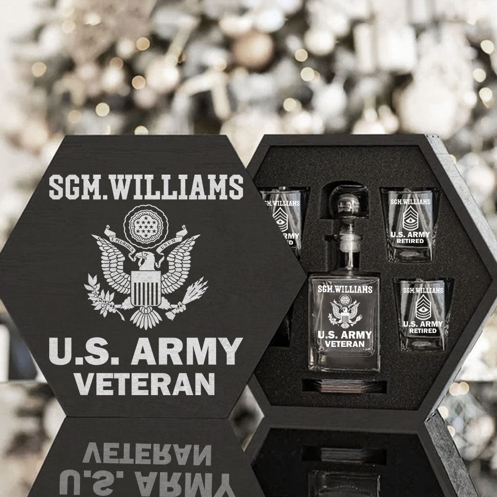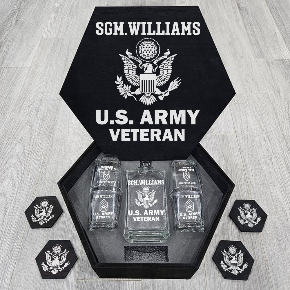 Custom Rank US Veteran Whiskey Hexagon Decanter Set Full Gift for Veteran Military Retirement H2511