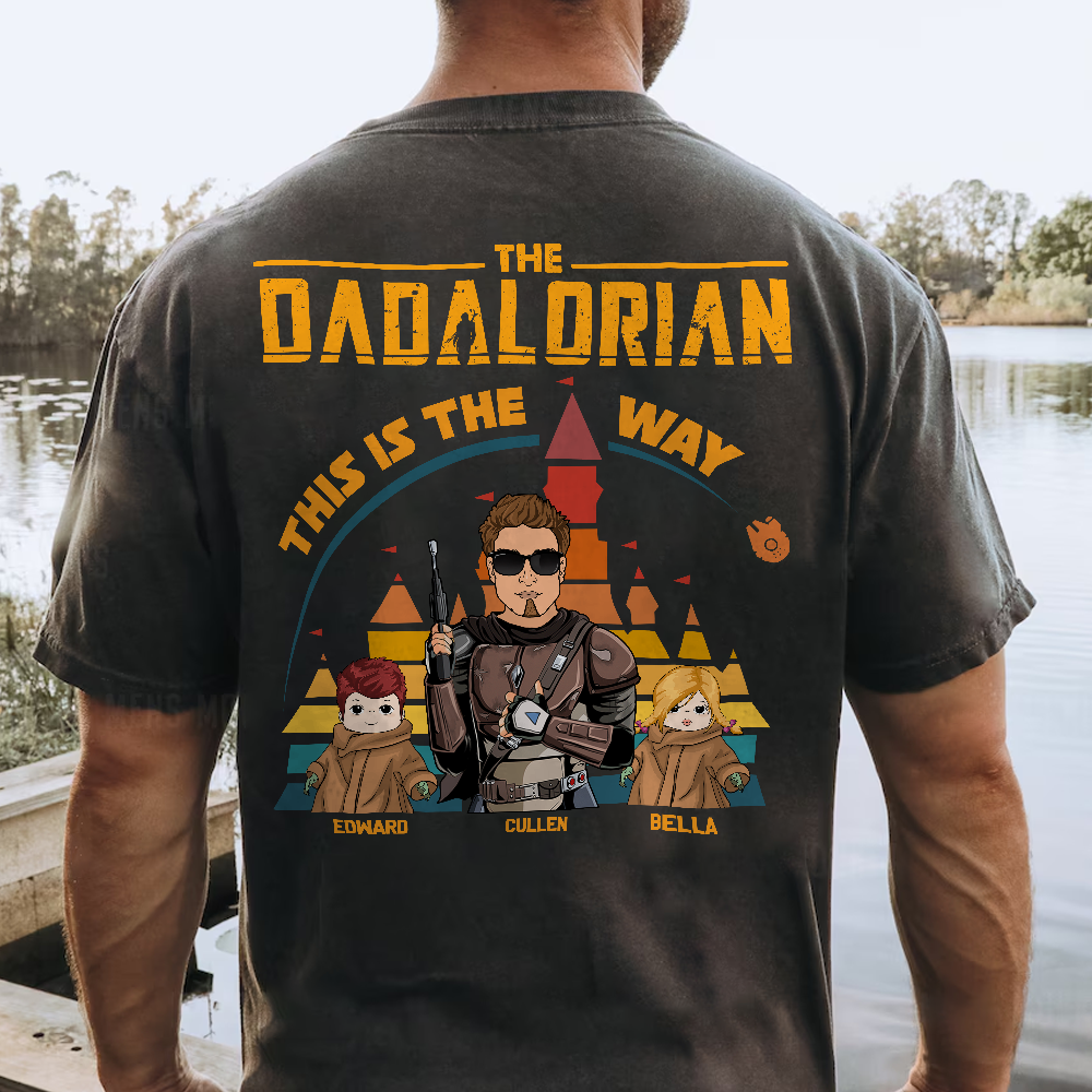 The Dadalorian This Is The Way" personalized back print shirt, a perfect gift for the hero of your family – Dad! This unique shirt allows you to customize it with Dad's nickname alongside the names of his beloved kids, making it a heartwarming and memorable gesture for Father's Day or his birthday.