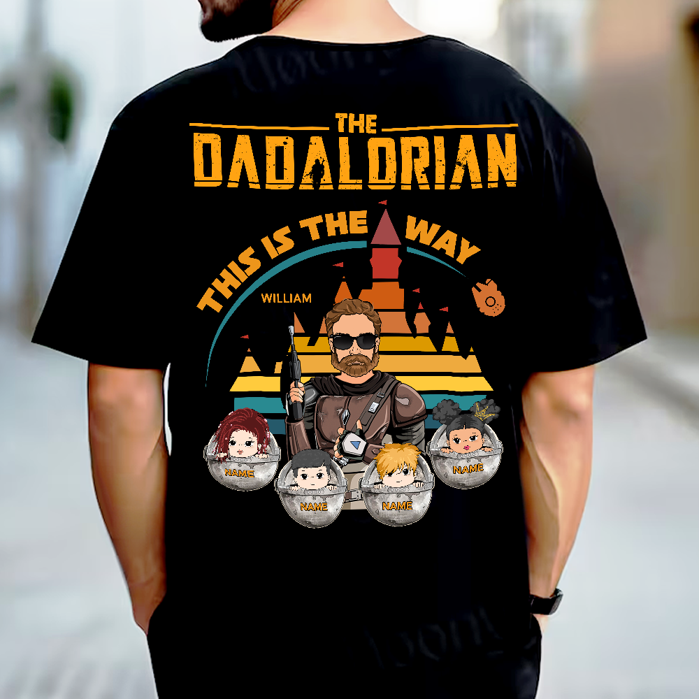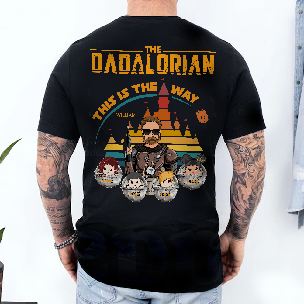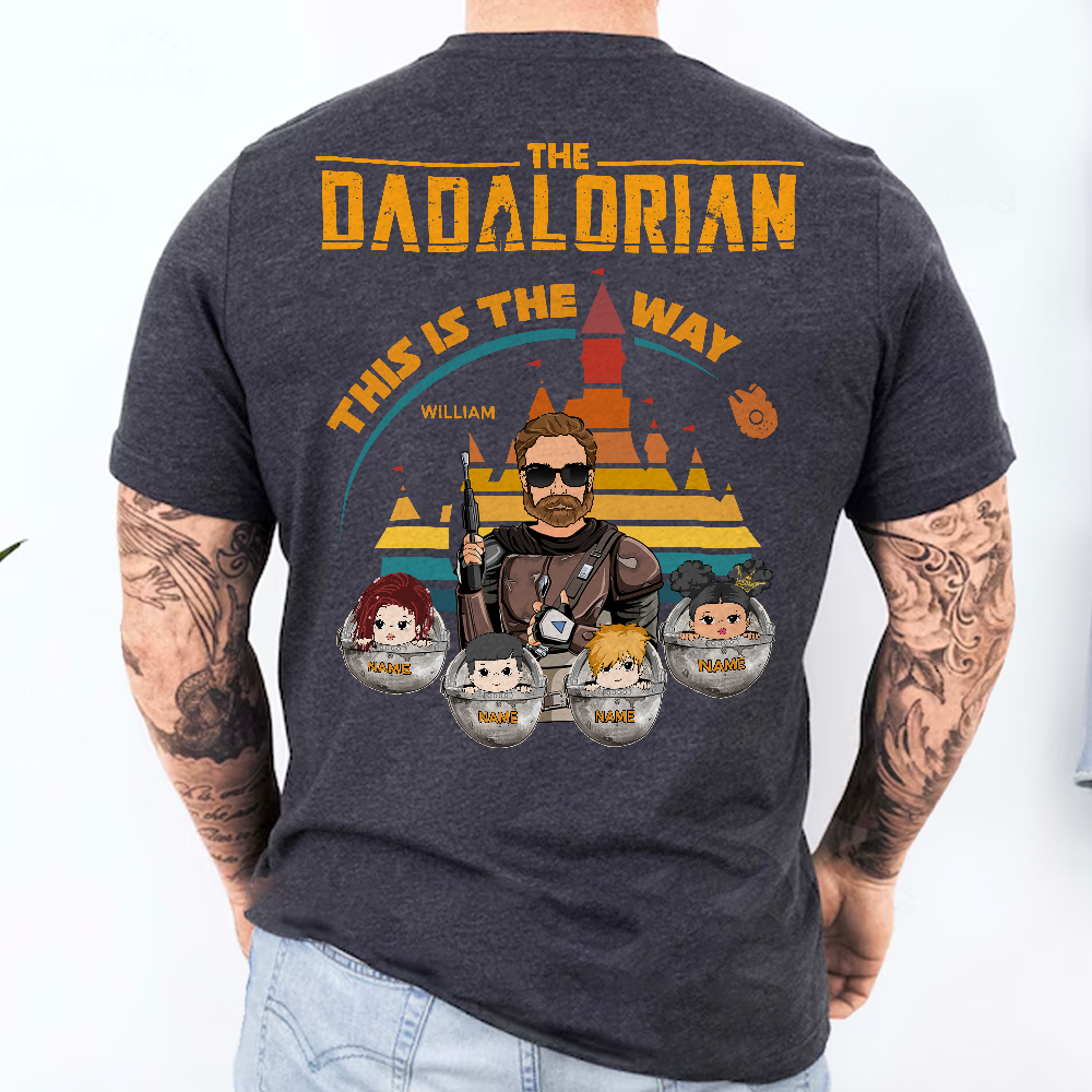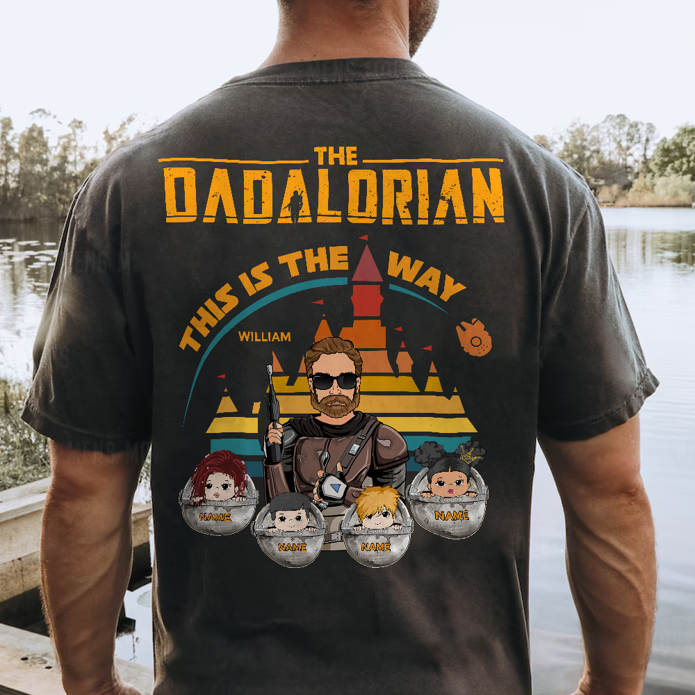 The Dadalorian This Is The Way" personalized back print shirt, a perfect gift for the hero of your family – Dad! This unique shirt allows you to customize it with Dad's nickname alongside the names of his beloved kids, making it a heartwarming and memorable gesture for Father's Day or his birthday.
